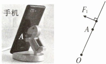 手机的重力$G$是阻力$F_{2}$,方向竖直向下,作用点在手机的重心$A$上,从$A$点沿竖直向下的方向画一条带箭头的线段表示$F_{2}$。