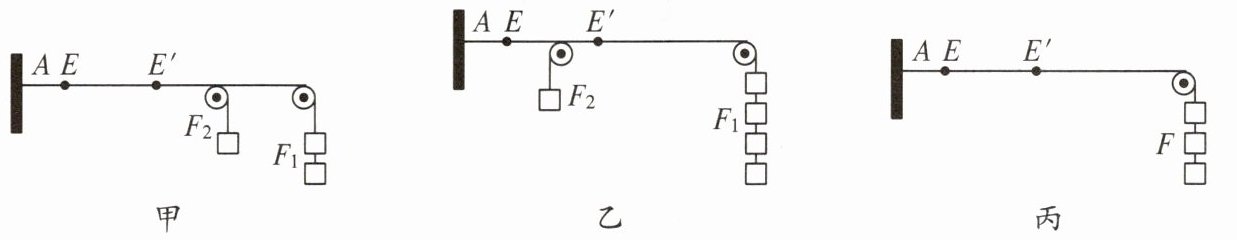 9. 如图所示是“探究同一直线上的二力合成”实验,橡皮筋原长 AE,在拉力的作用下伸长到$AE'$。下列说法不正确的是 ( )