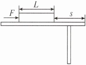 12. 如图所示,水平桌面上有一长$L=30cm$的长方形木板,其右端距桌面末端$s=25cm$,现用 8 N 的水平恒力 F 推木板,木板由静止开始运动,受到的阻力恒定为 4 N,为使得木板离开桌面,则推力至少需要推动距离为____cm,木板被推动阶段它在水平方向上受到的合力为____N。