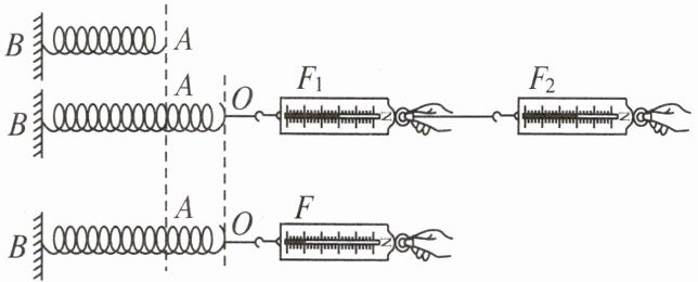 (1) 用两个弹簧测力计分别钩住橡皮筋上的两个细绳套,同时用适当的力朝同一个方向将橡皮筋拉到某一位置 O,在白纸上记下 O 的位置并记录两个力的大小$F_{1}$和$F_{2}$,换用一个弹簧测力计将橡皮筋朝同一个方向也拉到 O 点,记录下弹簧测力计的拉力大小为 F,通过实验可知:$F$____$F_{1}+F_{2}$,合力的方向跟这两个力的方向____。