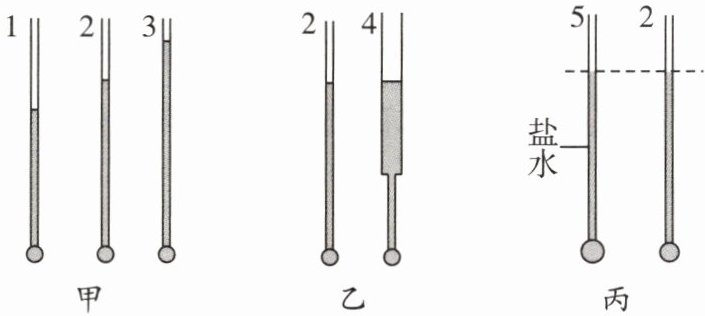 (4)图丙中,5号管和2号管的液柱长度相等,由此可探究液体压强与液体的____是否有关,并可得到结论:深度相同时,液体密度越大,产生压强____。