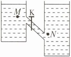 11. (多选)如图所示,甲、乙两个容器中盛有水并且水面相平,它们之间有斜管相通,$K$是开关。当$K$打开后,则()