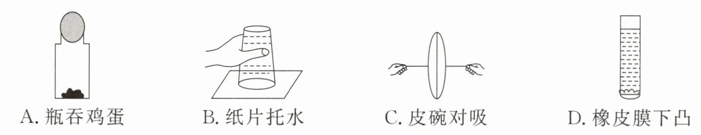 4. 能够证明大气压强存在的实验:冷水浇铁皮罐、皮碗实验;瓶子吞鸡蛋;覆杯实验等。