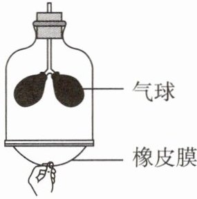 18. 如图是人呼吸过程的模拟装置。当向下拉动橡皮膜时,容器内的气压将____,气球在____的作用下体积变大,这个步骤是模拟人的____(选填“吸”或“呼”)气过程。