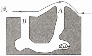 3. 如图是北美草原犬鼠洞穴的横截面示意图。它有两个出口,当风吹过隆起洞口A表面时,风速较大,吹过平坦洞口B时,风速较小,从而给洞中的犬鼠带去习习凉风。下列有关洞内风向分析正确的是( )
