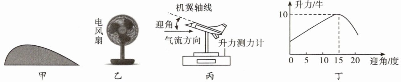 (2)他利用如图乙和图丙的电风扇、升力测力计、飞机模型进行实验探究。在探究升力与迎角的关系时,按以下步骤进行: