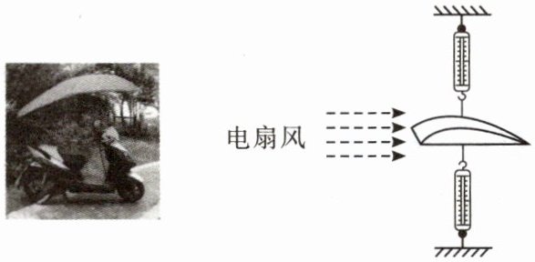 15. 夏天,小明的妈妈为了躲避热辣的阳光,在自行车的前把上安装了遮阳伞。可自从安装了这把伞后,妈妈骑车时总感觉车把像被人向上提起,这是为什么呢?为探究这个问题,小明制作了一个模型,并把它穿在一根铁丝上,在铁丝的上下各挂一支弹簧测力计,如图所示,然后用电吹风对着模型吹气,结果发现:上面的测力计示数变小,下面的测力计示数变大。
