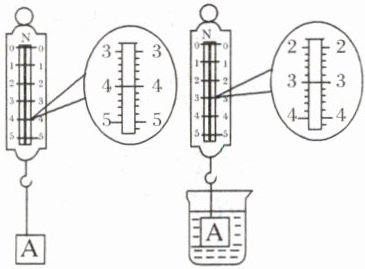 13. 如图所示是物体A浸入水中前后弹簧测力计示数的示意图。由此可知,物体的质量为____kg,物体受到的浮力为____N。(g取10N/kg)