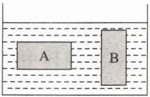 14. 如图所示,将完全相同的两个长方体分别水平和竖直放置在水中,它们上下表面受到的压力差和压强差的大小关系:$F_{A}$____$F_{B}$,$p_{A}$____$p_{B}$。(均选填“>”“<”或“=”)
