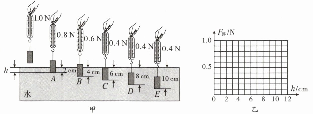 (2)如图甲所示,在弹簧测力计下悬挂一个高为6cm的长方体物块(可塑),测出重力。将它缓慢浸入水中,记录悬停在A、B、C、D、E五个位置弹簧测力计的示数和深度h。请根据实验数据,在图乙中画出物块所受浮力$F_{浮}$随h变化的图像。