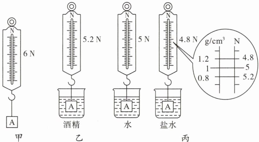 (1)如图乙所示,当物体浸没在不同的液体中时,液体密度越大,弹簧测力计示数越________。