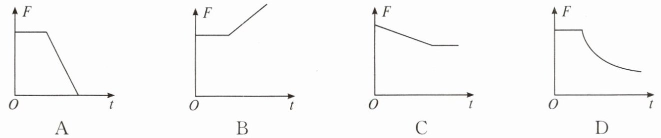 3. 小滨同学看到鸡蛋浮在盐水上面,如图所示。于是,他沿杯壁缓慢加入清水使鸡蛋下沉,在此过程中,鸡蛋受到的浮力$F$随时间$t$的变化图像可能是 ( )