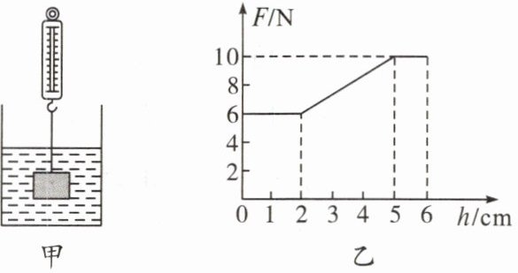 4. 如图所示,弹簧测力计下挂有一个圆柱体,把它从盛水的烧杯中缓慢提升,直到全部露出水面,该过程中弹簧测力计的示数$F$随圆柱体上升高度$h$的关系如图乙所示,$g$取$10N/kg$,下列说法正确的是 ( )