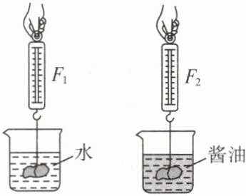 7. 把重为$G$的石块挂在弹簧测力计下,将石块分别浸没在水和酱油中,石块没有碰到容器底和容器壁,测力计的示数分别为$F_{1}$和$F_{2}$,以下判断不正确的是(水的密度用$ρ_{水}$表示) ( )