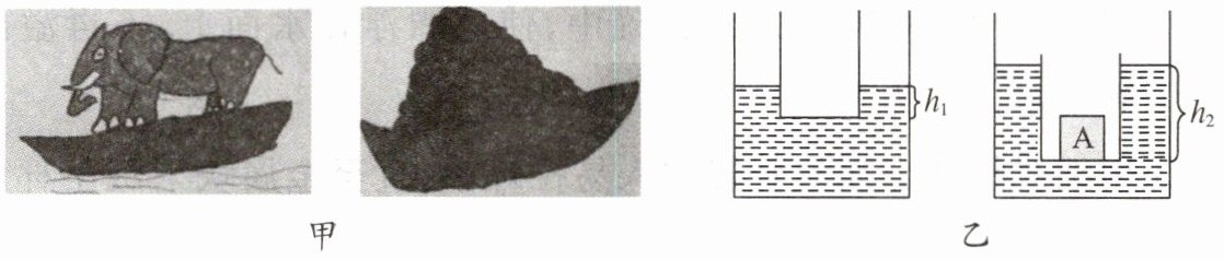 11. 图甲展示了一个历史故事“曹冲称象”。将大象和石子分别放在同一艘船上,通过观察两次船的吃水深度来判断大象和石子的______(选填“质量”或“体积”)是否相等。在小明学习了浮力的知识后,明白了其中的道理。受此启发,他设计了如图乙所示的方法测量物体$A$的质量,已知塑料盒的底面积为$10cm^{2}$,$h_{1}$大小为$5cm$,$h_{2}$大小为$13cm$,则物体$A$的质量______$g$;放入$A$物体后,水对塑料盒底的压强为______$Pa$。(已知$ρ_{水}=1.0×10^{3}kg/m^{3}$,$g$取$10N/kg$)。