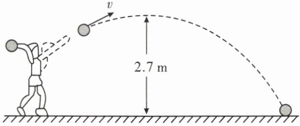 8. 在体育考试中,小明投出的实心球在空中的运动轨迹如图所示。若实心球质量是$2kg$,从最高点到落地点的过程中,球下降的高度为$2.7m$,用时为$0.75s$,则球下降过程中重力做功为________$J$,功率为________$W$。($g$取$10N/kg$)