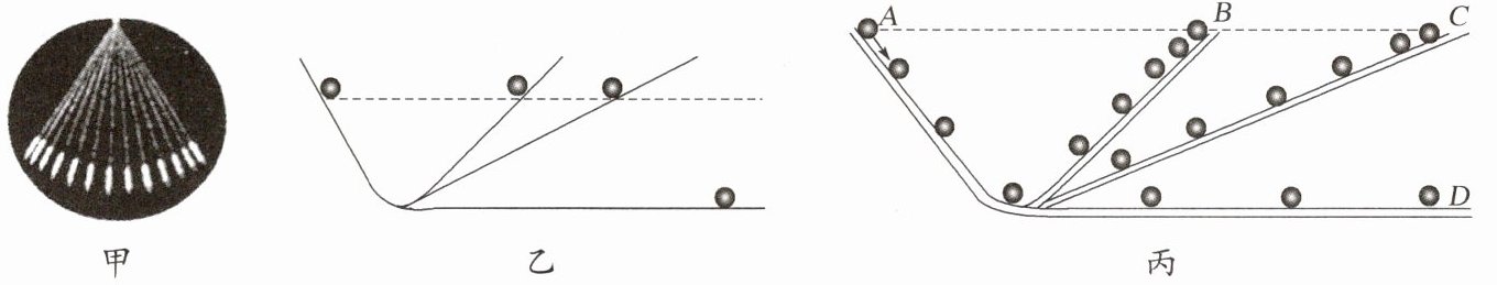 (1)像科学家那样进一步思考:图丙是伽利略想象的每隔相同时间在右边不同坡度的斜坡上球的位置,他认为当斜坡倾角变小时,________________________。于是他大胆推测:当斜坡变成水平时,球的速度不再变小,球将做匀速滚动。