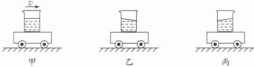 16. 【科学思维】如图甲所示,盛有水的烧杯随小车一起水平向右做______(选填“匀速”“加速”或“减速”)运动;若此时小车突然刹车减速,烧杯中的水面应是图______(选填“乙”或“丙”)的状态,作出上述判断的依据是______(选填“水”或“烧杯”)具有惯性。