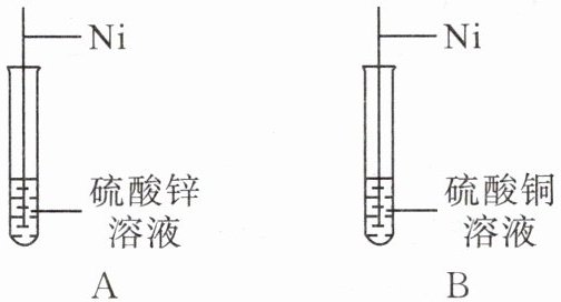 3. 金属镍在制造钱币、不锈钢、催化剂等方面有着广泛的应用。为探究镍(Ni)、锌、铜的金属活动性顺序,小明做了如图所示的实验,发现A试管中镍丝表面无现象,B试管中镍丝表面出现红色物质,则三种金属活动性由强到弱的顺序是 (