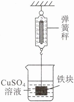 10. 通常情况下,相同体积的溶液中溶质质量越大,溶液密度越大。如图,将悬挂在弹簧秤上的铁块浸没在${CuSO_{4}}$中,一段时间后,弹簧秤的示数变大,溶液体积变化忽略不计。下列有关表述错误的是 (