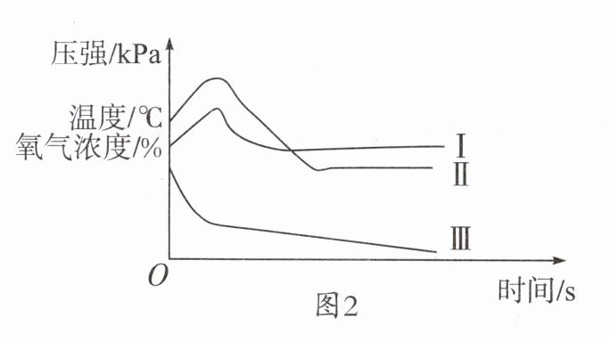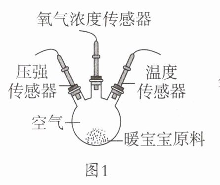 14. 某同学在图1三颈瓶中加入一定量的暖宝宝原料(主要成分为铁粉和碳粉),并滴加几滴水,分别用压强、氧气浓度和温度三种数字传感器绘制出数据变化曲线如图2所示。下列说法正确的是 (