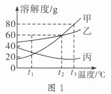 9. 甲、乙、丙三种固体的溶解度曲线如图 1 所示,如图 2 是选用图 1 中某种固体进行实验时的情况。下列说法正确的是(
