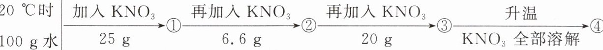 13. 已知20℃时$KNO_{3}$的溶解度为31.6g。20℃时,对100g水进行下图所示操作,分别得到相应的溶液①~④,下列有关说法不正确的是 (