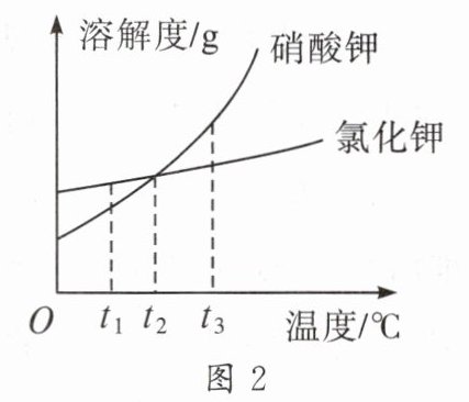 15. $t_{1}^{\circ }C$时,将相同质量的$KNO_{3}$和KCl分别加入盛有100g水的甲、乙烧杯中,充分搅拌后现象如图1所示,图2为两物质的溶解度曲线。以下说法正确的是 (