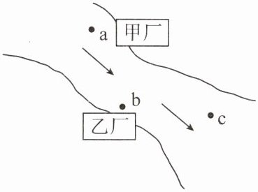 6. 甲、乙两化工厂分布如图所示。箭头代表水流方向。如果在a处取得水样经检测含有的阴离子是$OH^{-}$、$SO_{4}^{2-}$。在c处取得水样经检测$pH = 7$,且只含有少量$NaCl$,则b处水中含有的物质可能是(