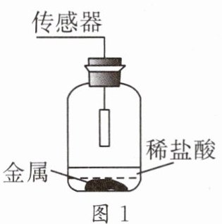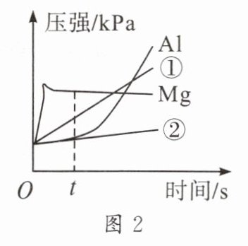 13. 兴趣小组同学用相同形状的铁、镁、铝、锌四种金属分别和等浓度等体积的足量稀盐酸用图1所示装置进行实验,反应过程气压变化如图2所示,下列说法错误的是 (