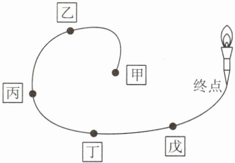 17. (5分)如下图所示,甲、乙、丙、丁、戊五种物质(或其溶液)俨然是赛道上参加接力比赛的“运动员”,相邻“运动员”之间能发生化学反应。已知:五种物质分别是Fe、HCl、NaOH、$ {CaCO_{3}} $和$ {CuCl_{2}} $中的一种,其中,甲是单质,丁与戊反应产生的气体可以熄灭终点的火炬。