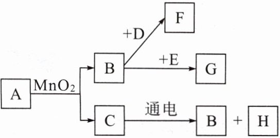 已知A、C是无色液体,B、G、H是无色气体,E在纯净的B中燃烧产生蓝紫色火焰,D在纯净的B中燃烧火星四射。