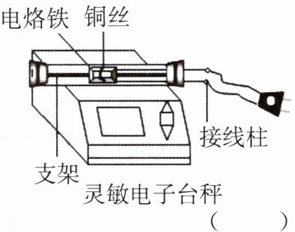14. 右图为小柯做的创新实验:将铜丝绕在电烙铁上,电烙铁用支架固定在密闭的硬质玻璃管中,玻璃管置于灵敏电子台秤上。接通电路,电烙铁开始工作,可以观察到铜丝表面逐渐变黑,电子台秤读数保持不变。下列说法中正确的是 (
