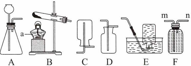 (4)氢气密度比水小,用装置$F$排水法收集氢气时,气体应从短管进,即装置$A$的导管应该和装置$F$的$n$端相连。