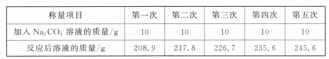 第五次加入10g碳酸钠溶液时,生成二氧化碳的质量为(238.24g + 10g) - 248.24g = 0g,说明第四次加入碳酸钠溶液后盐酸已完全反应。