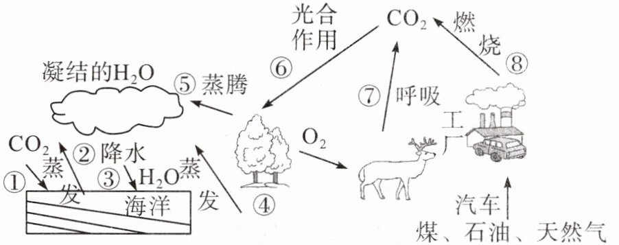 7. 如图是自然界存在的三大重要循环“水循环”“氧循环”和“碳循环”。用学科观点分析“氧循环”和“碳循环”,其中不正确的是 (