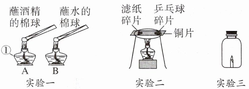 。(2)实验一中,加热片刻观察到 A 中棉球上的酒精燃烧,产生蓝色火焰,B 中棉球上的水不燃烧,由此得出燃烧的条件之一是