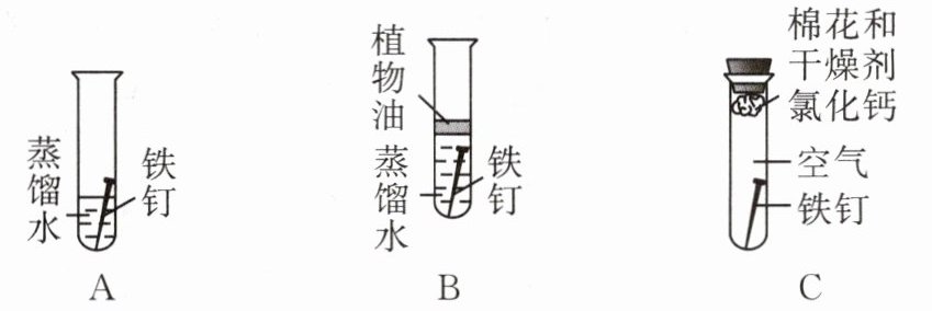 ②A中铁钉与水和氧气(或空气)接触生锈,B中铁钉只与水接触(植物油隔绝了氧气)不生锈,C中铁钉只与氧气(或空气)接触(氯化钙吸收了水)不生锈,由此得出铁钉锈蚀需要与水和氧气(或空气)接触的结论。
