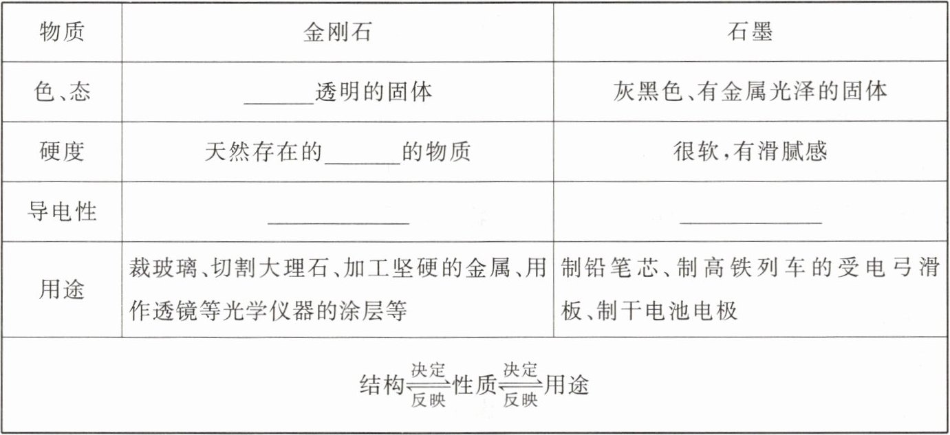 【解析】:金刚石是无色透明的固体,是天然存在的最硬的物质,不导电;石墨是灰黑色、有金属光泽的固体,很软,有滑腻感,导电。