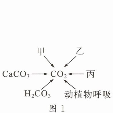 19. 二氧化碳在大气循环中起着重要作用,图1是产生二氧化碳的途径,其中丙是一种黑色固体单质,请回答下列问题: