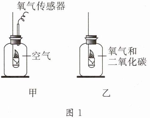 。(2) 图1是探究密闭装置中蜡烛(主要含碳、氢元素)熄灭影响因素的一组对比实验(所用蜡烛及装置均相同),乙瓶中氧气与二氧化碳体积比为1:4。图2是利用氧气传感器测定的实验过程中甲瓶内氧气体积分数的变化曲线。实验中观察到甲、乙两瓶中现象相同:蜡烛均先正常燃烧,而后同时慢慢熄灭。图1设计对比实验的目的是