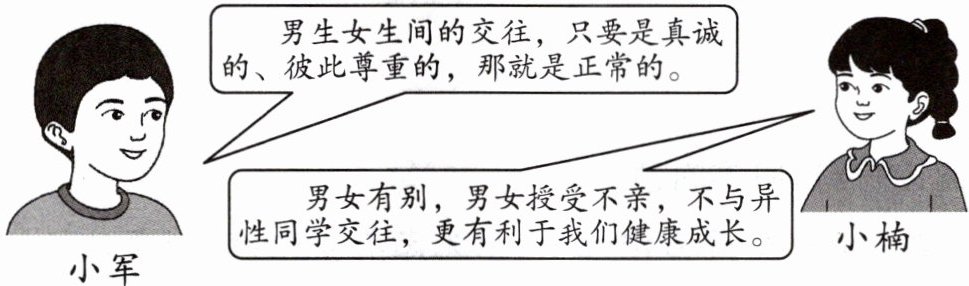 围绕“男生女生交往”这个话题,小军和小楠发表了自己的看法。