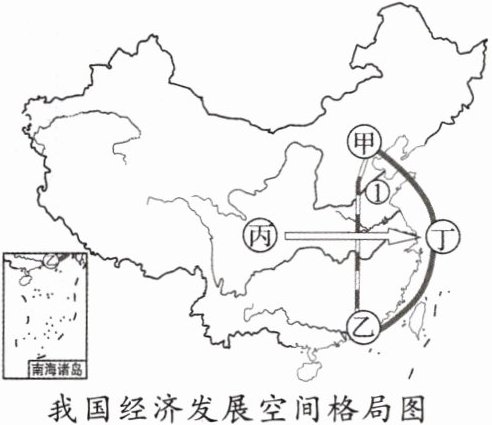 改革开放几十年来,我国形成了“弓箭型”的经济发展空间格局。读图,完成13~14题。