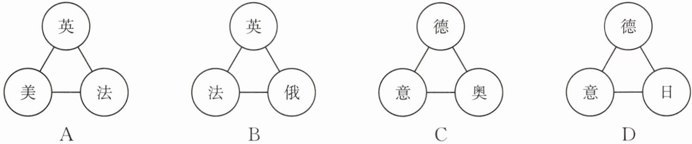 2. 19 世纪末 20 世纪初,为重新分割世界形成了三国同盟和三国协约两大敌对的军事集团。下列示意图中属于三国同盟的是 (