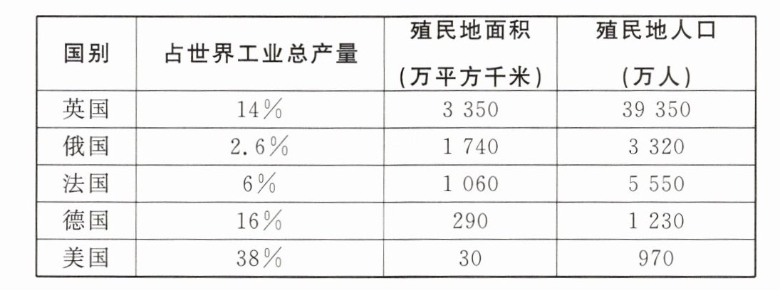 材料一 1913—1914 年列强经济实力及其占有殖民地的情况
