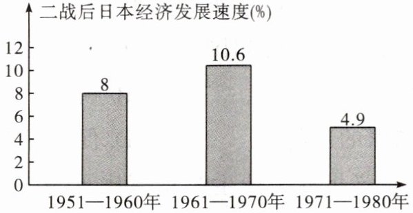 8. 如下图所示,二战后到 20 世纪 80 年代日本经济快速发展,尤其是 1961—1970 年,下列选项中属于这一阶段日本经济快速发展的原因是 (
