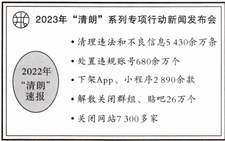 。材料二:网络空间天朗气清、生态良好是整个社会的共同期待。2023年3月28日上午,国务院新闻办公室举行2023年“清朗”系列专项行动新闻发布会。会议指出,2022年,国家网信办组织开展13项“清朗”专项行动,取得了良好效果(见下图),有力维护了网民合法权益。