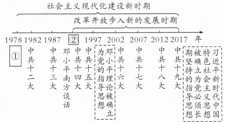 (1)根据材料一,将年代尺中①②处的内容补充完整。结合所学知识回答邓小平理论的形成过程。①: