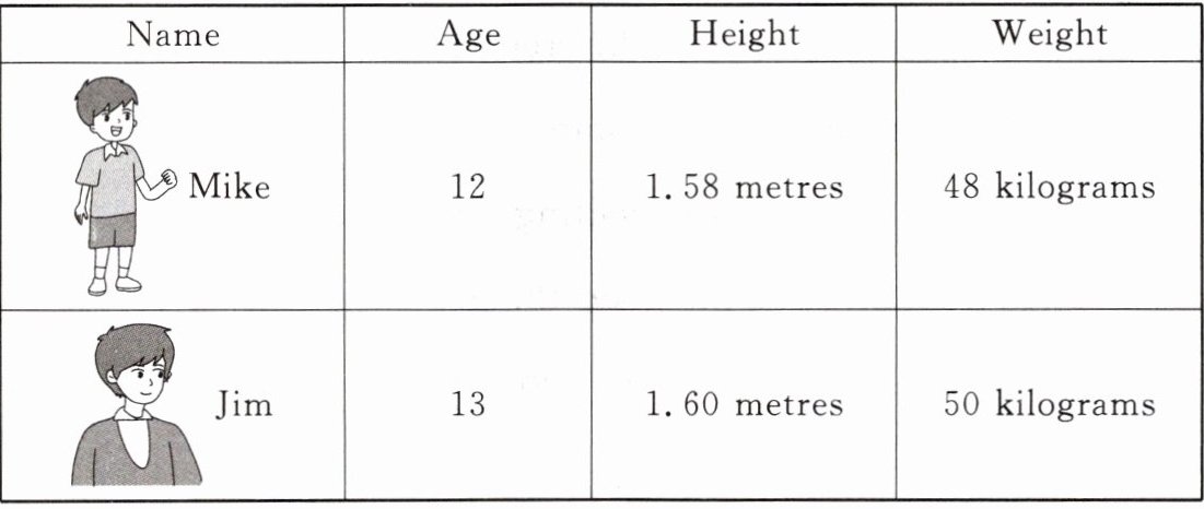 Mike and Jim are good friends. Mike is 12 years old. Jim is 13 years old. Jim is older than Mike. Mike is 1.58 metres. Jim is 1.60 metres. Jim is taller than Mike. Mike is 48 kilograms. Jim is 50 kilograms. Jim is heavier than Mike. They are good friends.