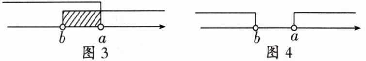 若未知数的取值比大数小,比小数大,则不等式组的解集在两数之间,取公共部分(如图3);所以在图3中,不等式组的解集为$b<x$或$x<a$.